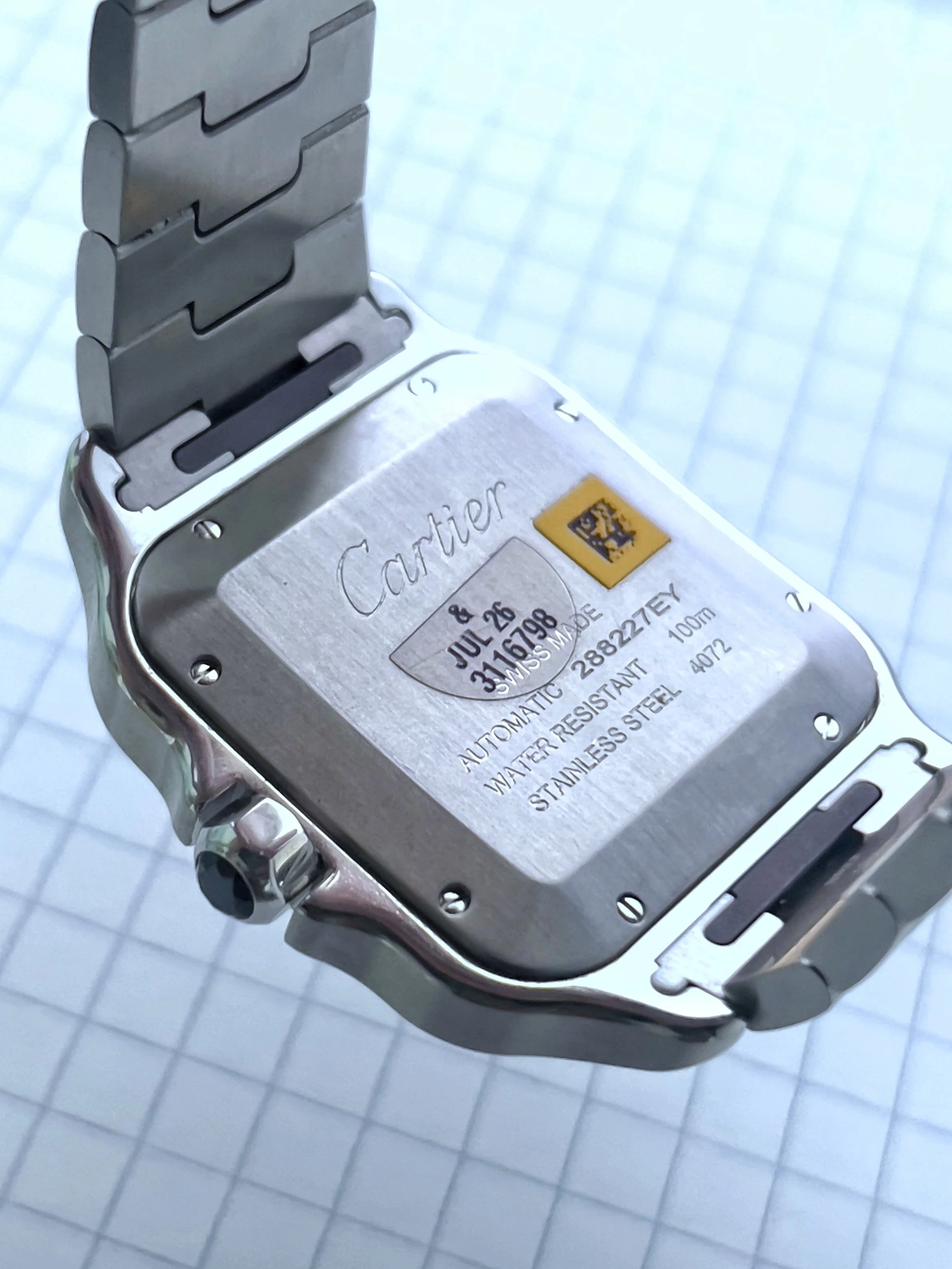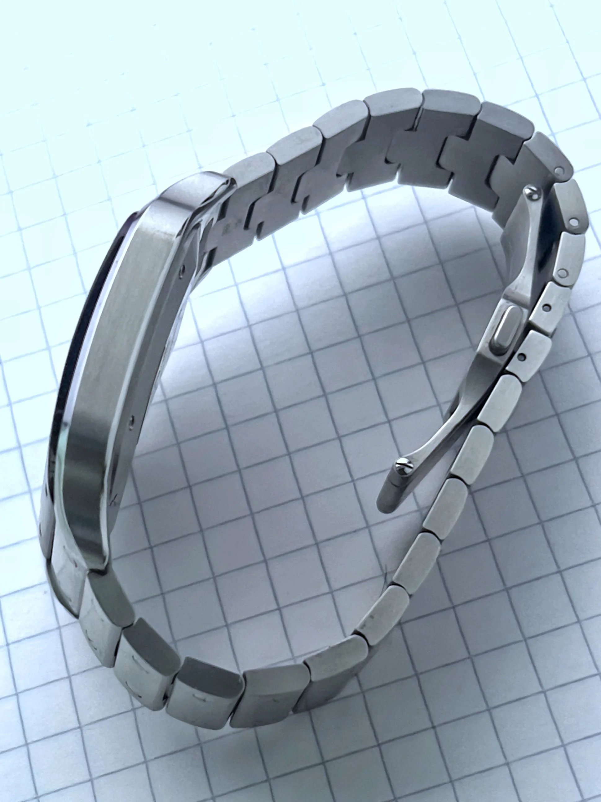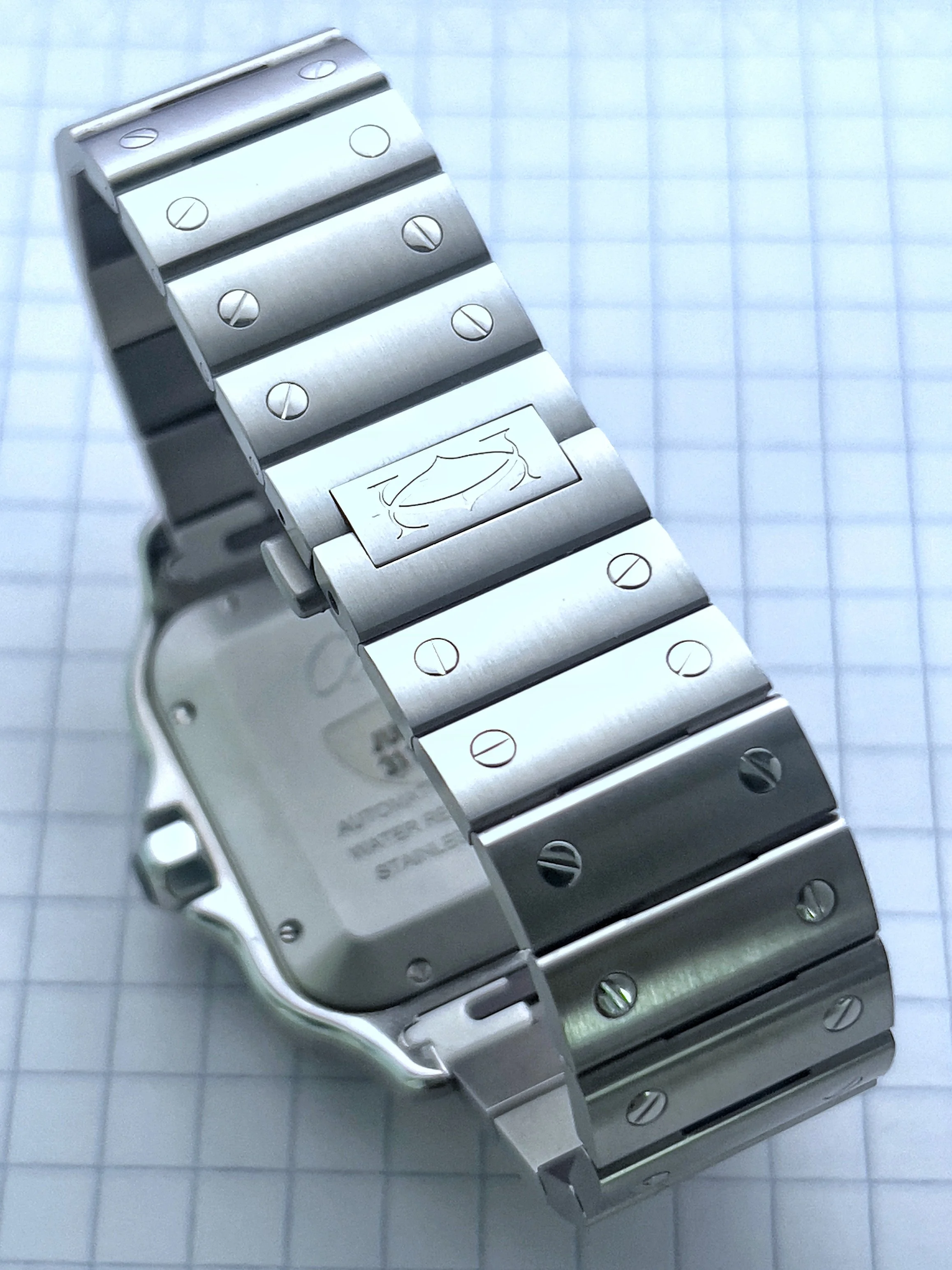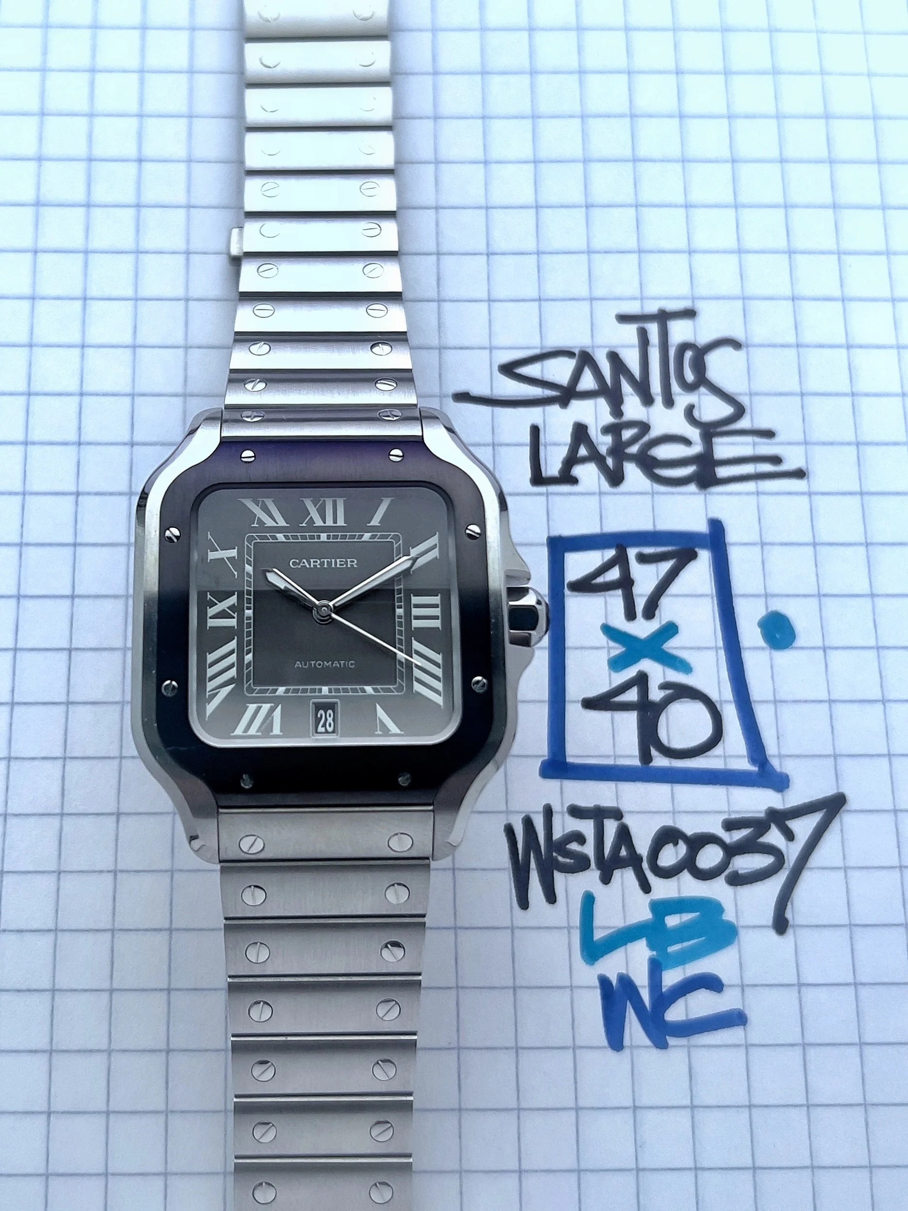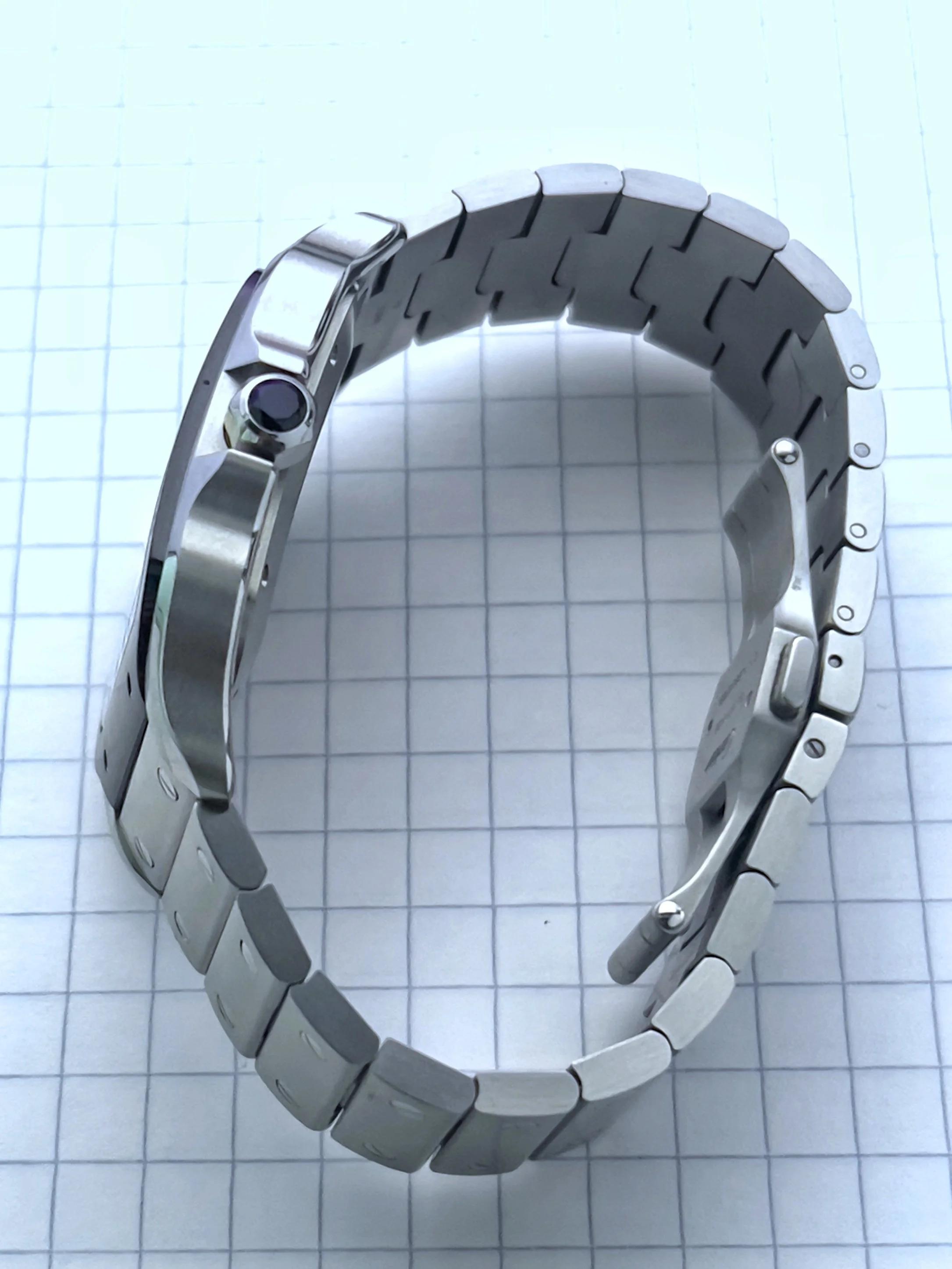 The Santos is not only an icon for Cartier but also in the canon of watch design as it is arguably the most desirable model today both modern and neo-vintage with steel case and blue hands. These are usually found in two-tone but here we offer a steel variation with a long bracelet and we can accommodate any wrist size plus extra but only recommend this one for a 7.25in wrist and under for aesthetics. The movement is quartz with a quickset date. Overall light signs of wear and polish but no damage.