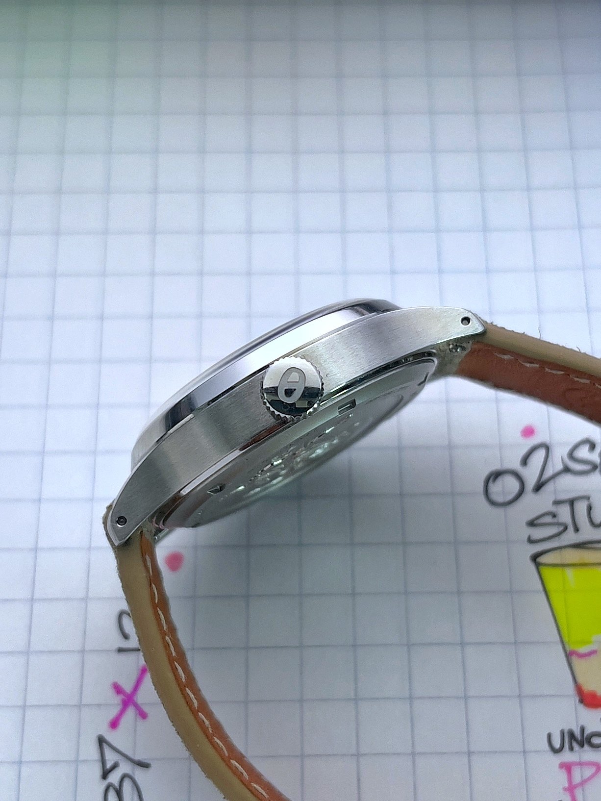 As charming as it gets. These midcentury timepieces are not only aesthetically pleasing from design, font and proportions but it also has serviceable complications and a hardy manual wind movement. On the non-crown side of the case, there is a button for quickset date so keeping this one in the rotation is easy—just rotate through for the day. While no service history, the movement is clean and running smooth and strong.