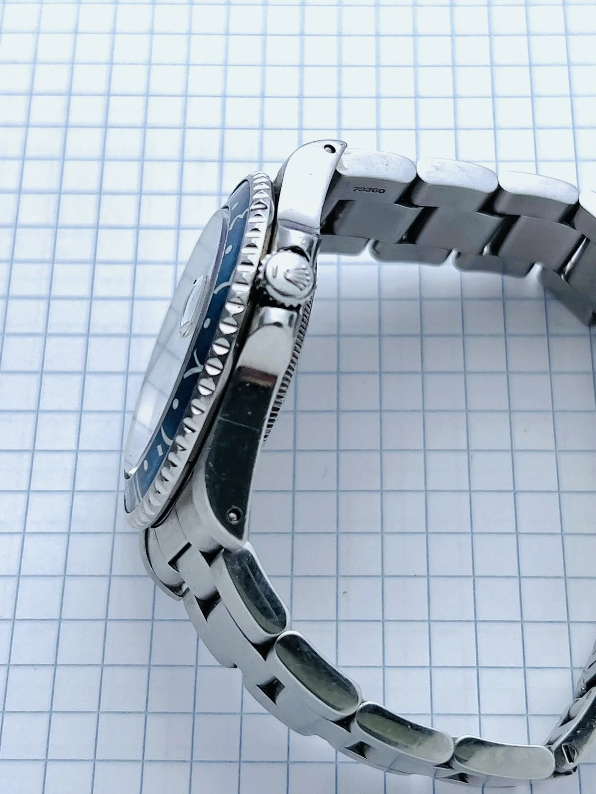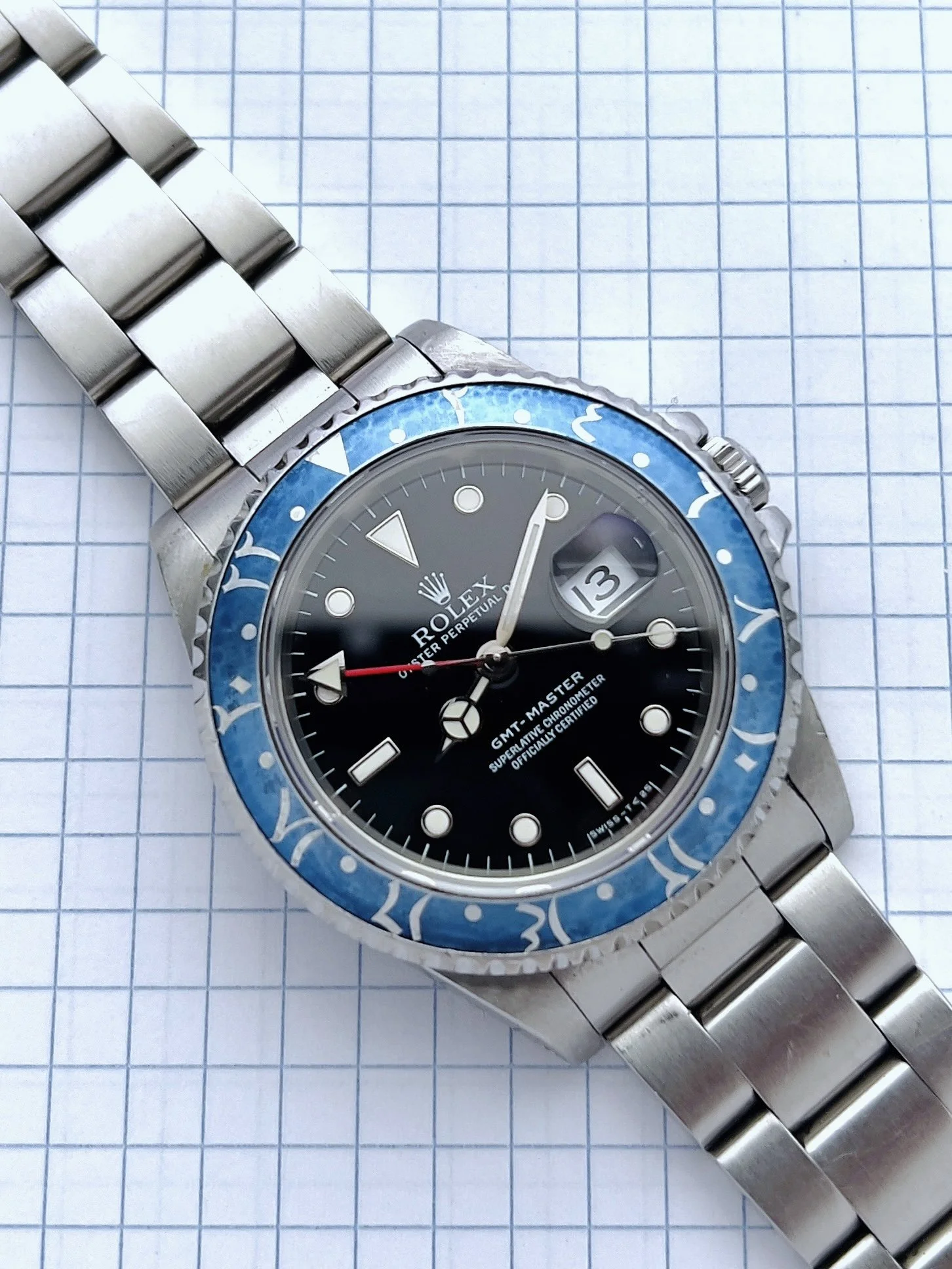 We have a fun one! At Long Beach Watch Club, “it ain’t that serious” yet we still keep it 100%. Here we have installed an aftermarket tropical indigo Arabic insert; however, we also have the original oem Rolex factory black one as well. Oh you ask are those papers? Yes, we have the punched papers too. This GMT is from 1996 with a T-serial on case and tritium dial and fitted on matching 1996 v-stamped hollow endlink bracelet.